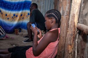 A young girl in Kakuma Refugee Camp connects to the internet from a smartphone.